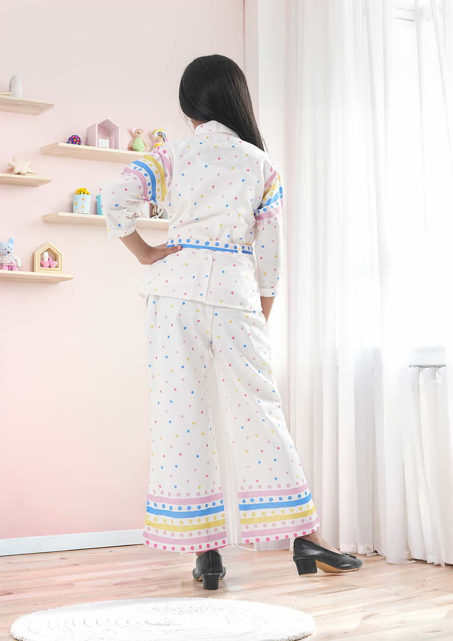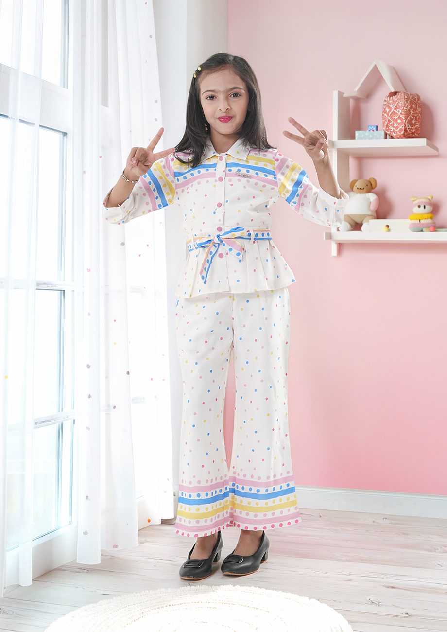 Refresh your little girl’s wardrobe with this elegant and trendy white polka dot co-ord set from SWEETY NX. Designed with soft multicolor dot prints and stylish pastel stripe detailing, this outfit perfectly blends comfort with modern fashion. Ideal for birthday parties, festive celebrations, casual outings, and family gatherings, this coordinated set gives a smart and graceful look.
