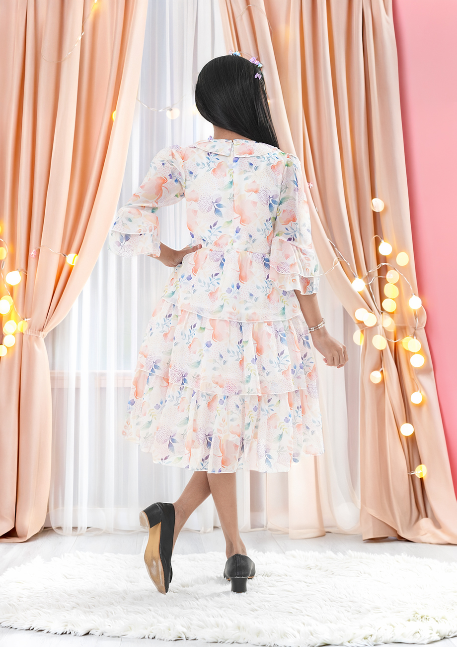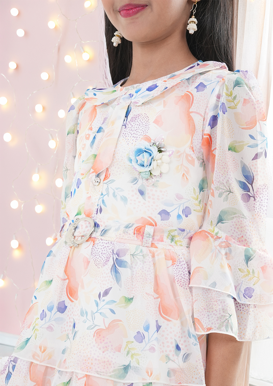 Let your little princess sparkle in this dreamy peach floral layered dress from SWEETY NX. Designed with soft pastel floral prints in soothing shades of peach, blue, and lavender, this elegant dress is perfect for birthday parties, festive occasions, weddings, and special celebrations. The delicate color combination gives a graceful and premium party-ready look.